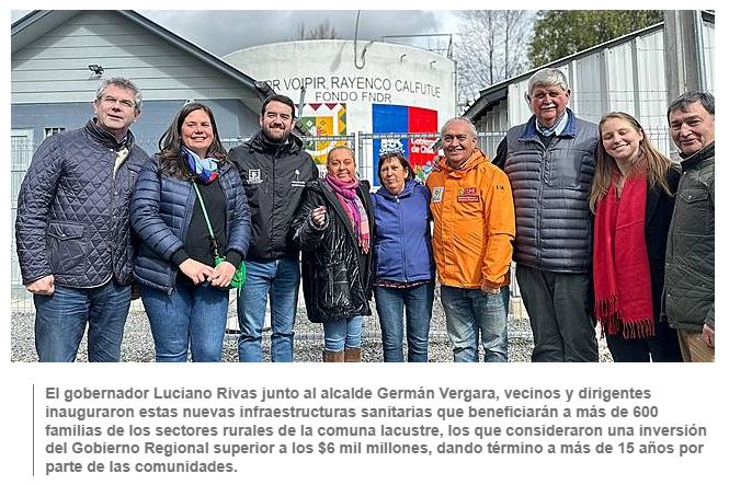 El gobernador Luciano Rivas junto al alcalde Germán Vergara, vecinos y dirigentes inauguraron estas nuevas infraestructuras sanitarias que beneficiarán a más de 600 familias de los sectores rurales de la comuna lacustre, los que consideraron una inversión del Gobierno Regional superior a los $6 mil millones, dando término a más de 15 años por parte de las comunidades.